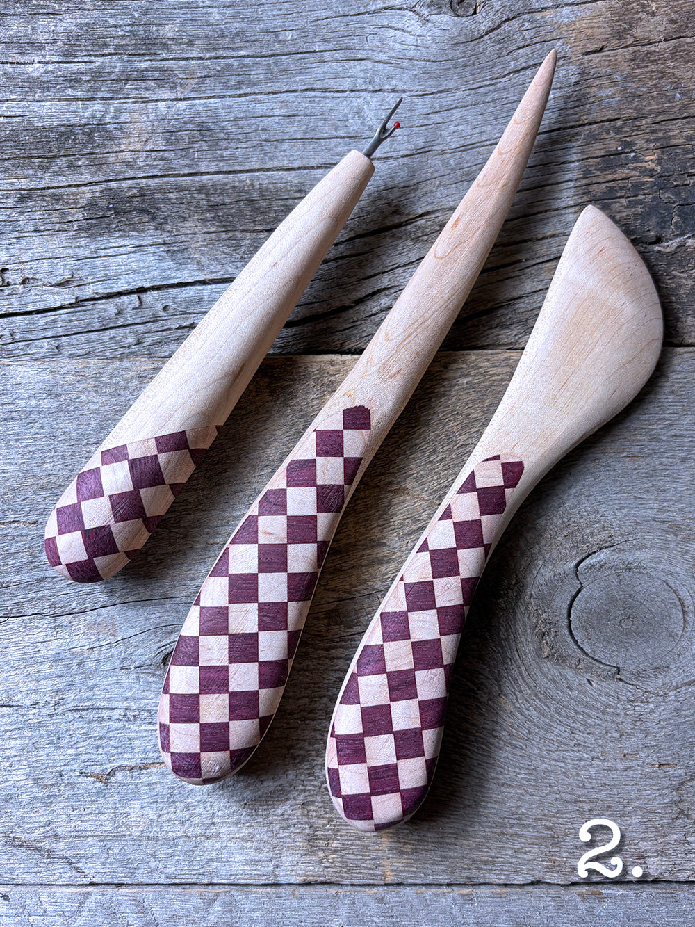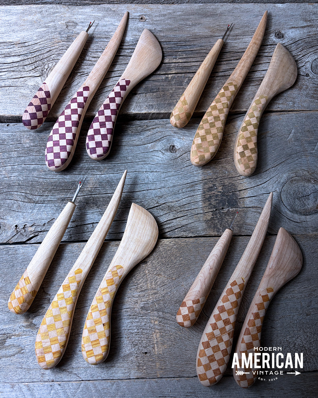 Where my chess playing quilters at?! Each of these tools is made with Curly Maple and a schmorgasboard of different colored exotic woods!