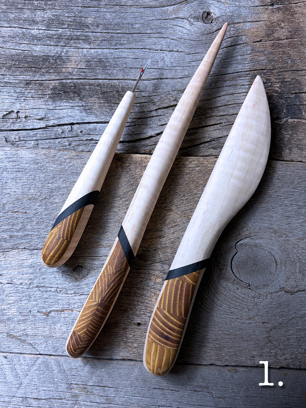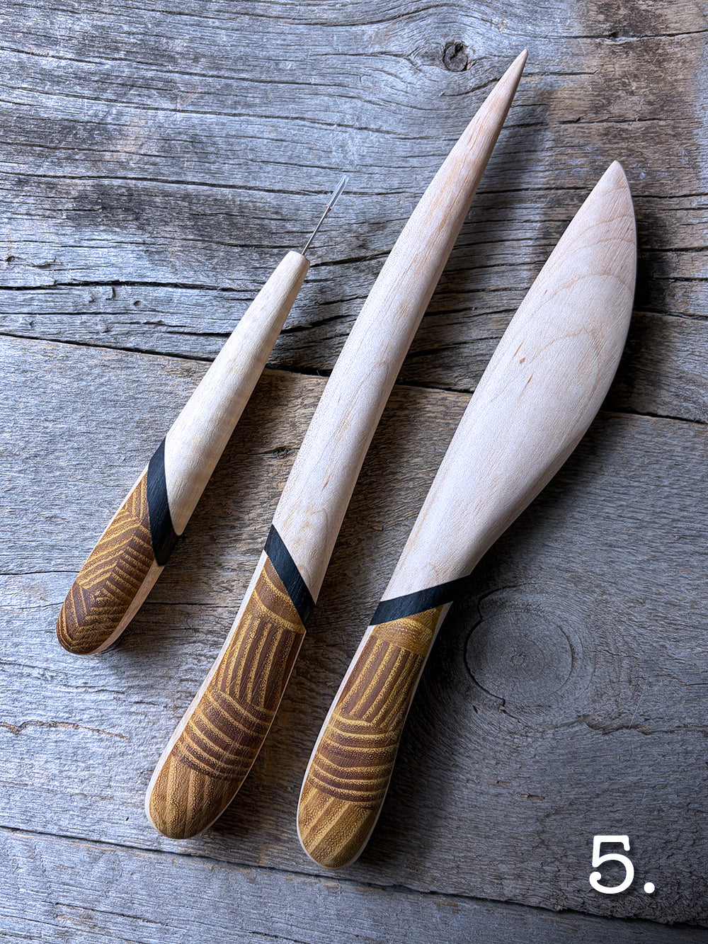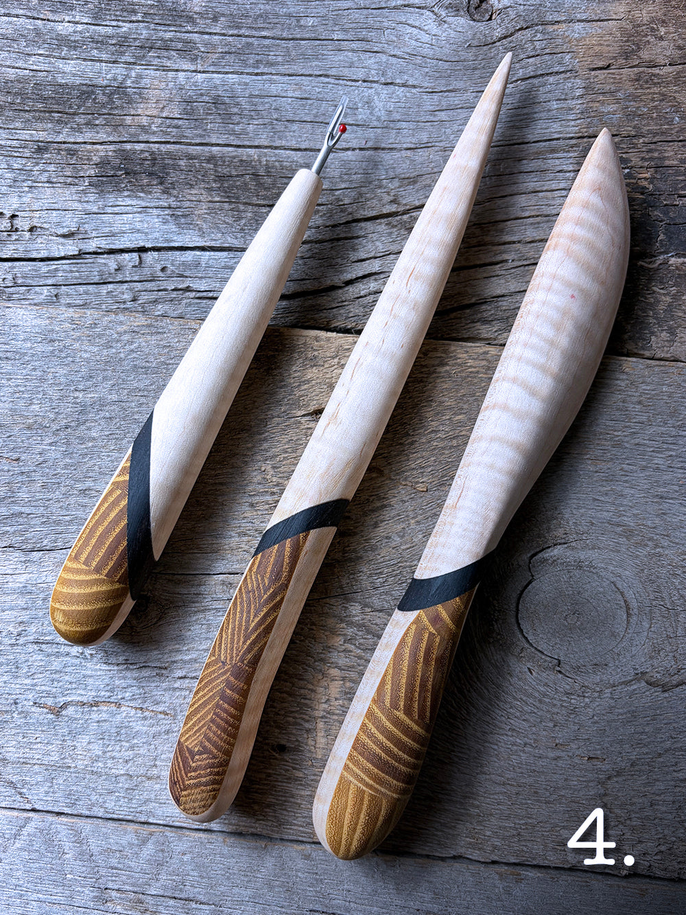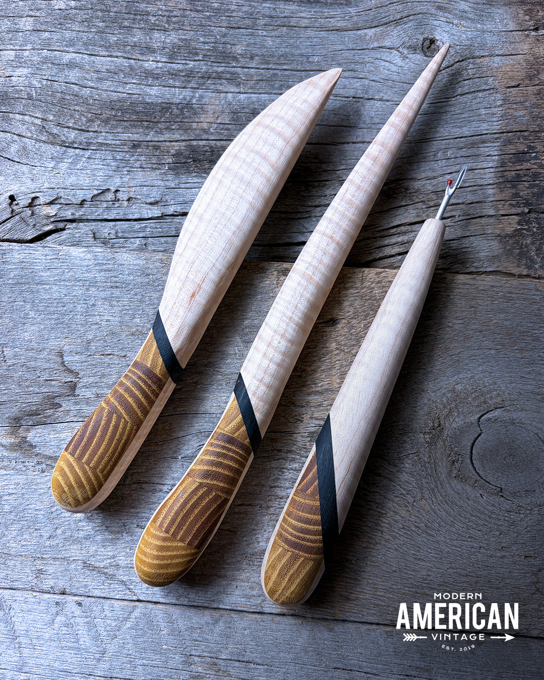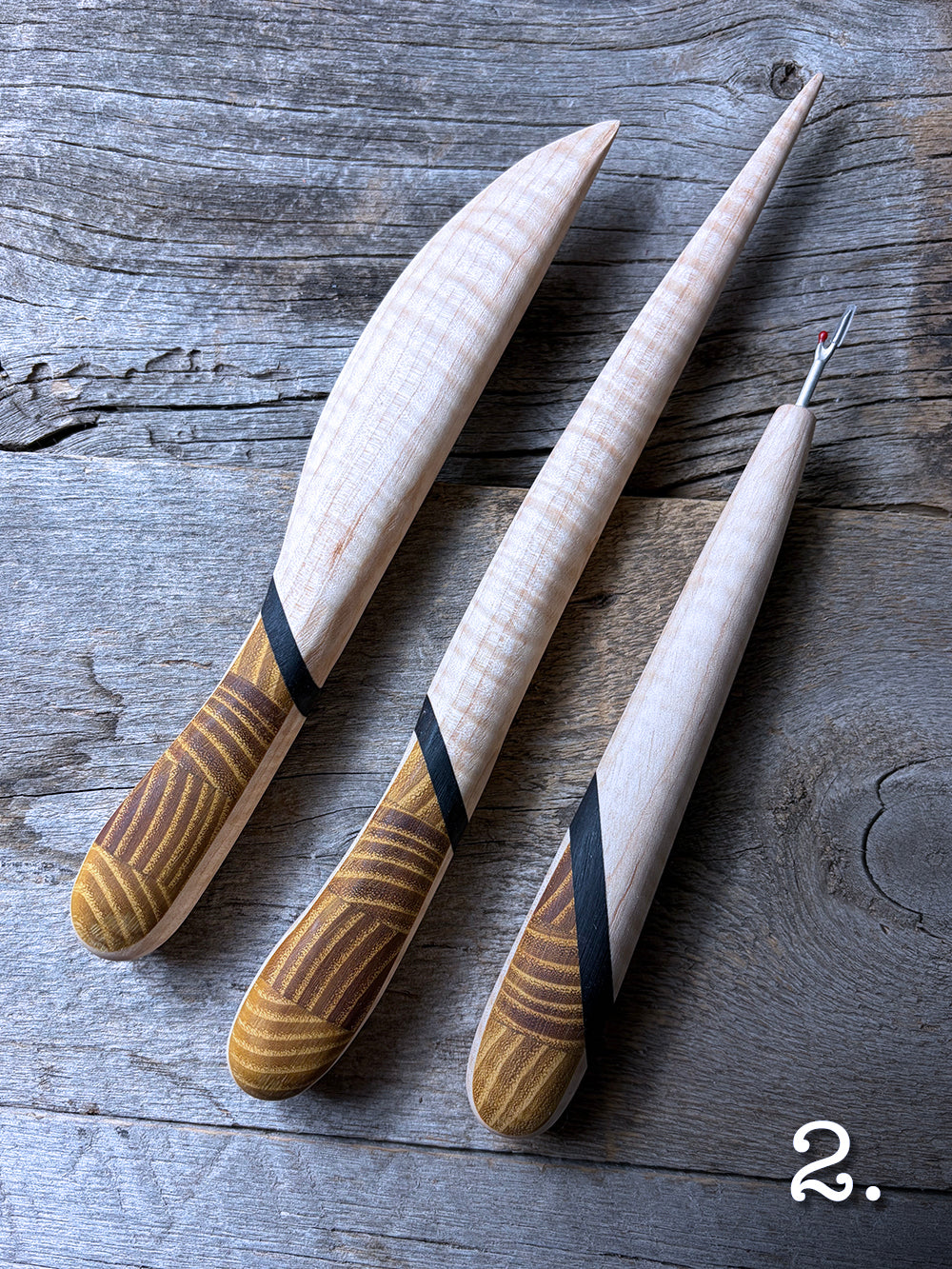 Being mindful of the end grain of a piece of wood can open up so many amazing opportunities for design! Osage orange offers a range of possibilities with its high contrasting growth rings, so I thought some diamond patterns were in order for the handles and would go perfectly with Curly or Birdseye Maple blades separated by a band of African Blackwood.