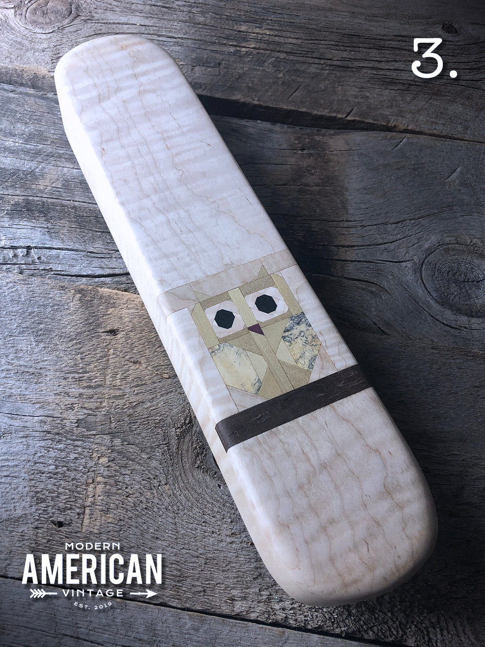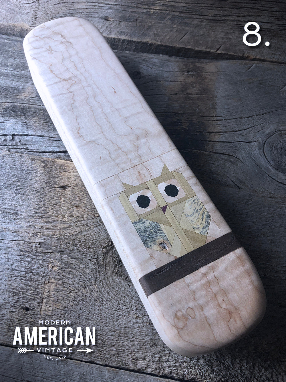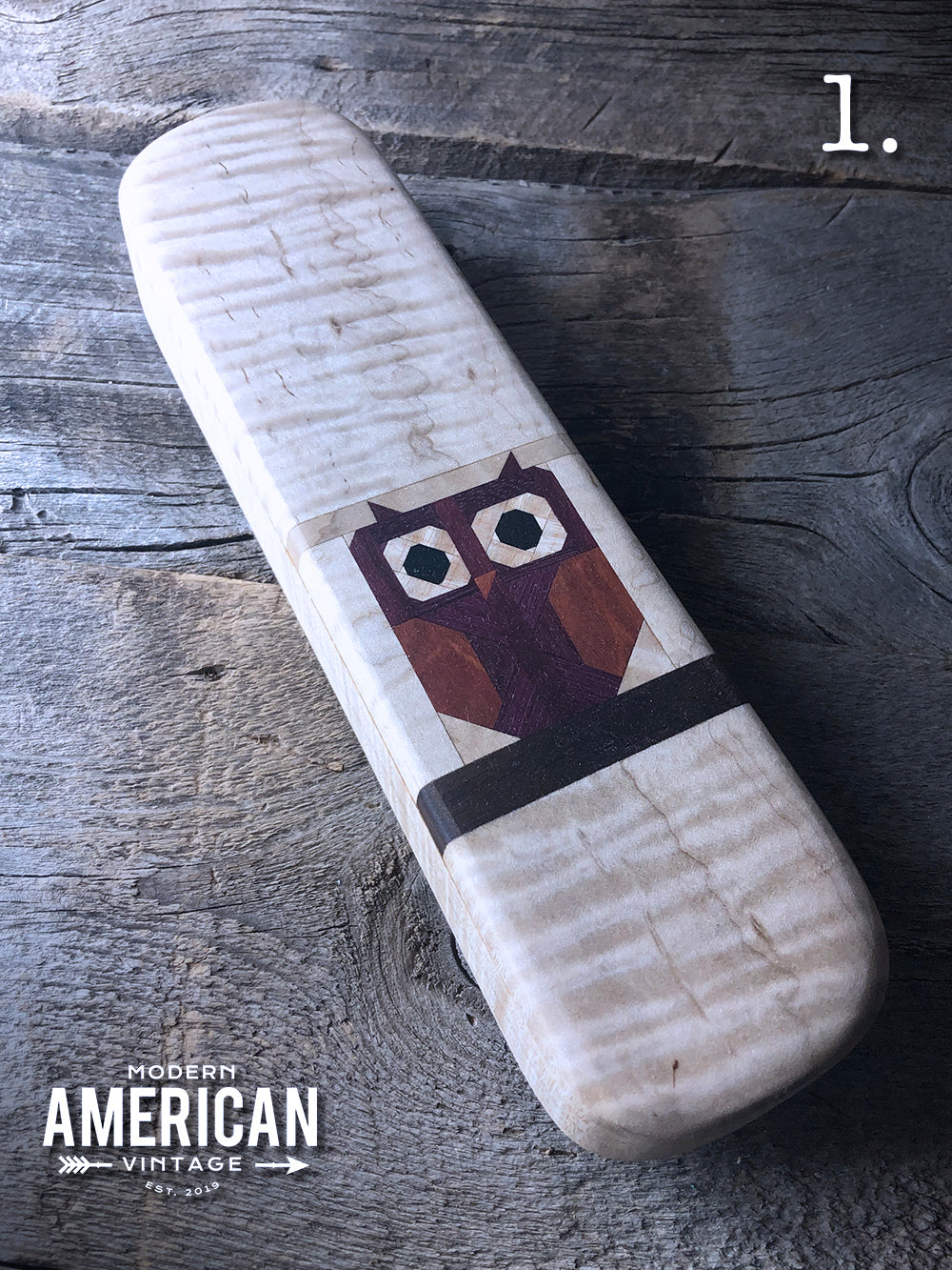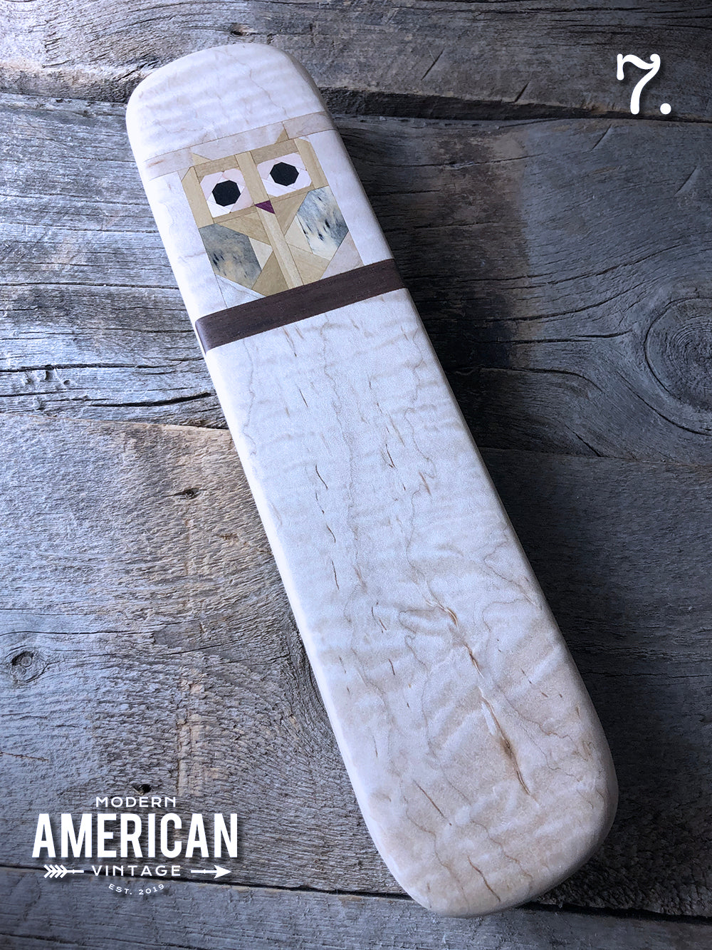 These clappers are approximately 12x2.75x1.5" unless marked, and the wood combos of the owls are as follows: