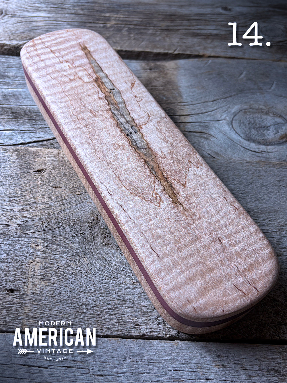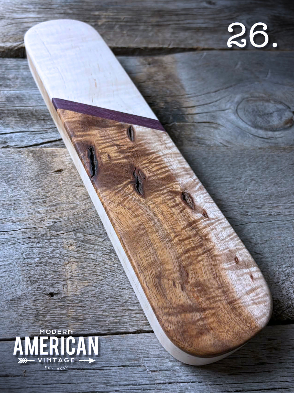 - Curly Hawaiian Koa (With bark inclusions), Purpleheart and Curly Maple top on Curly Maple base - 12.75x2.75x1"