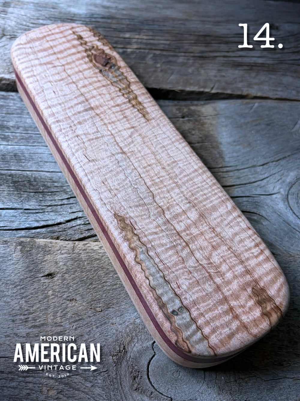 - Curly Hawaiian Koa (With some bark inclusions), Purpleheart and Figured Maple top on Maple base - 13.25x2.75"