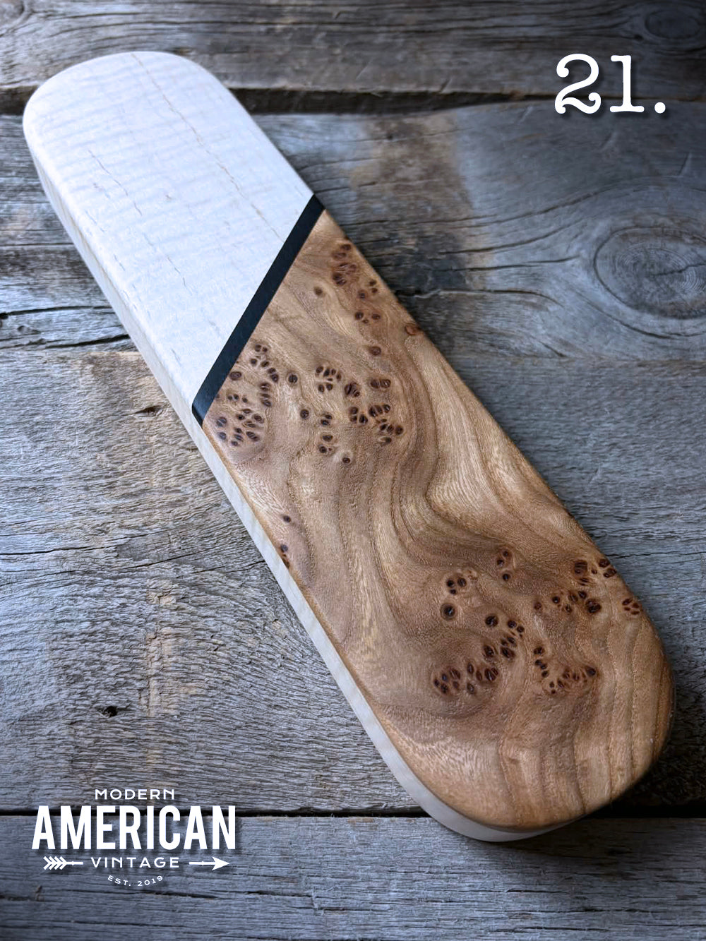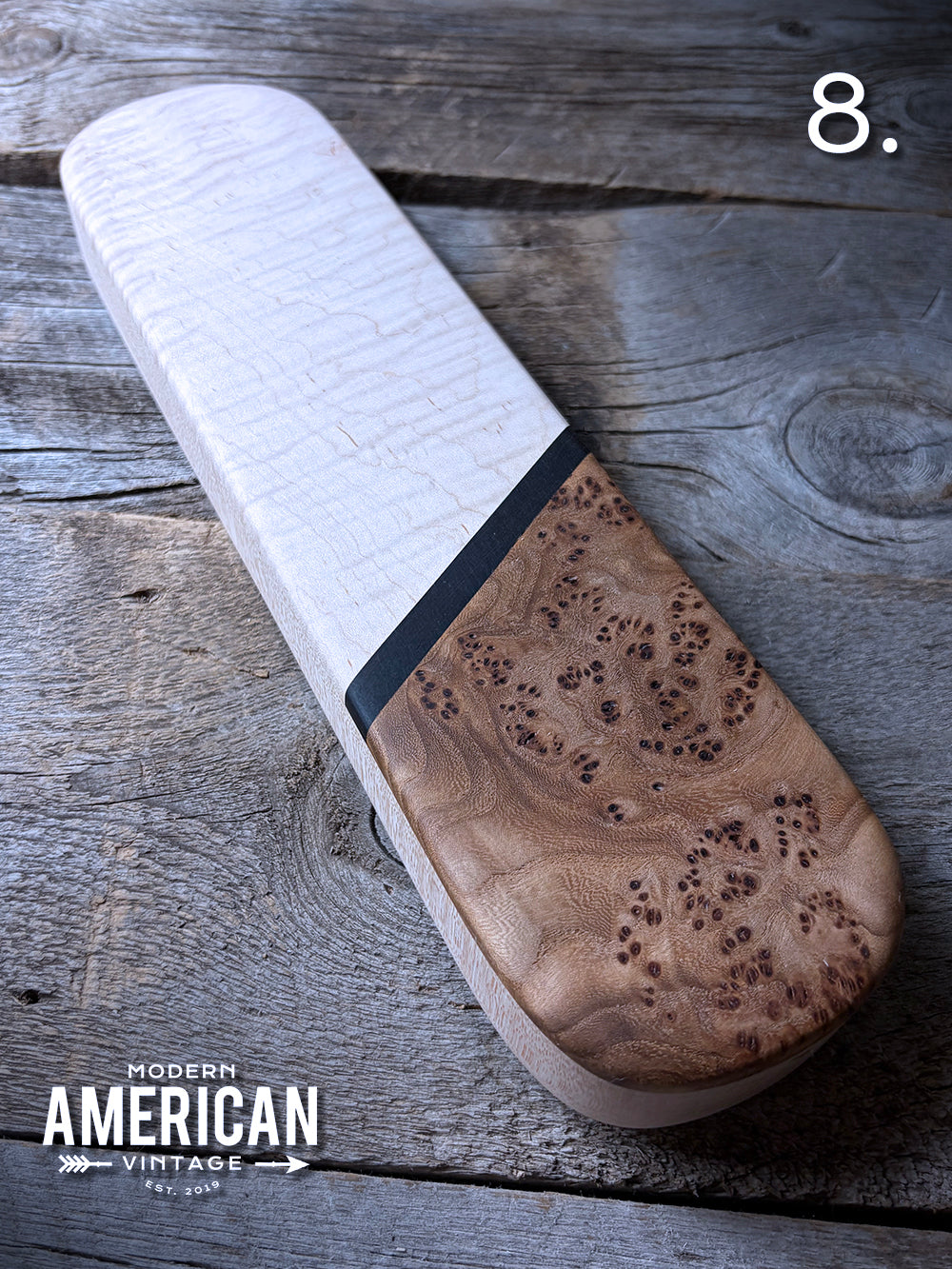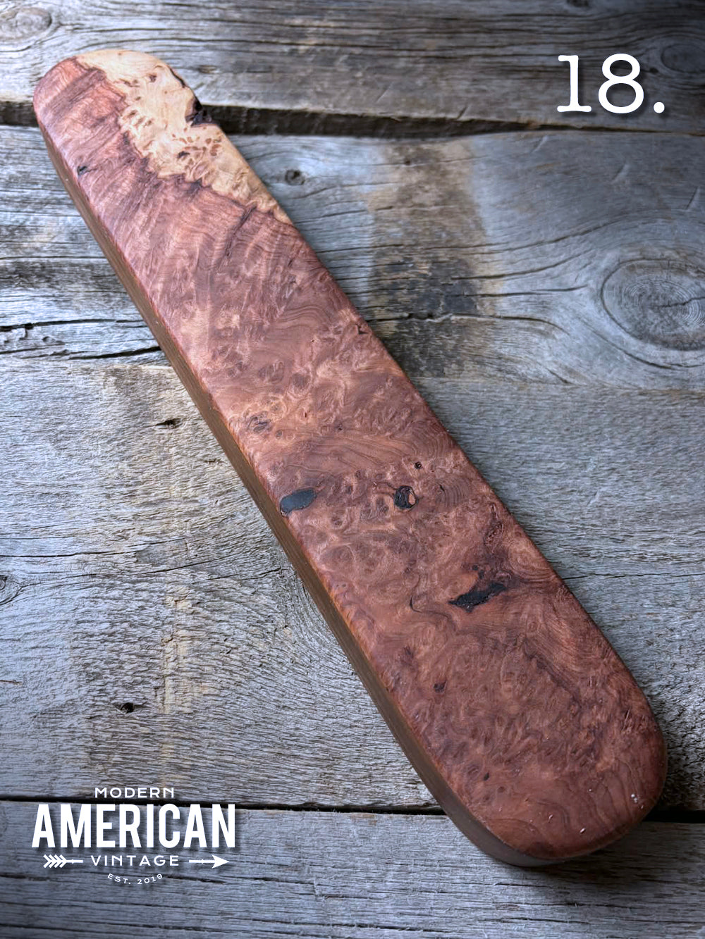 - Curly Maple, Elm Burl and African Blackwood top on Curly Maple bottom - 12x3"