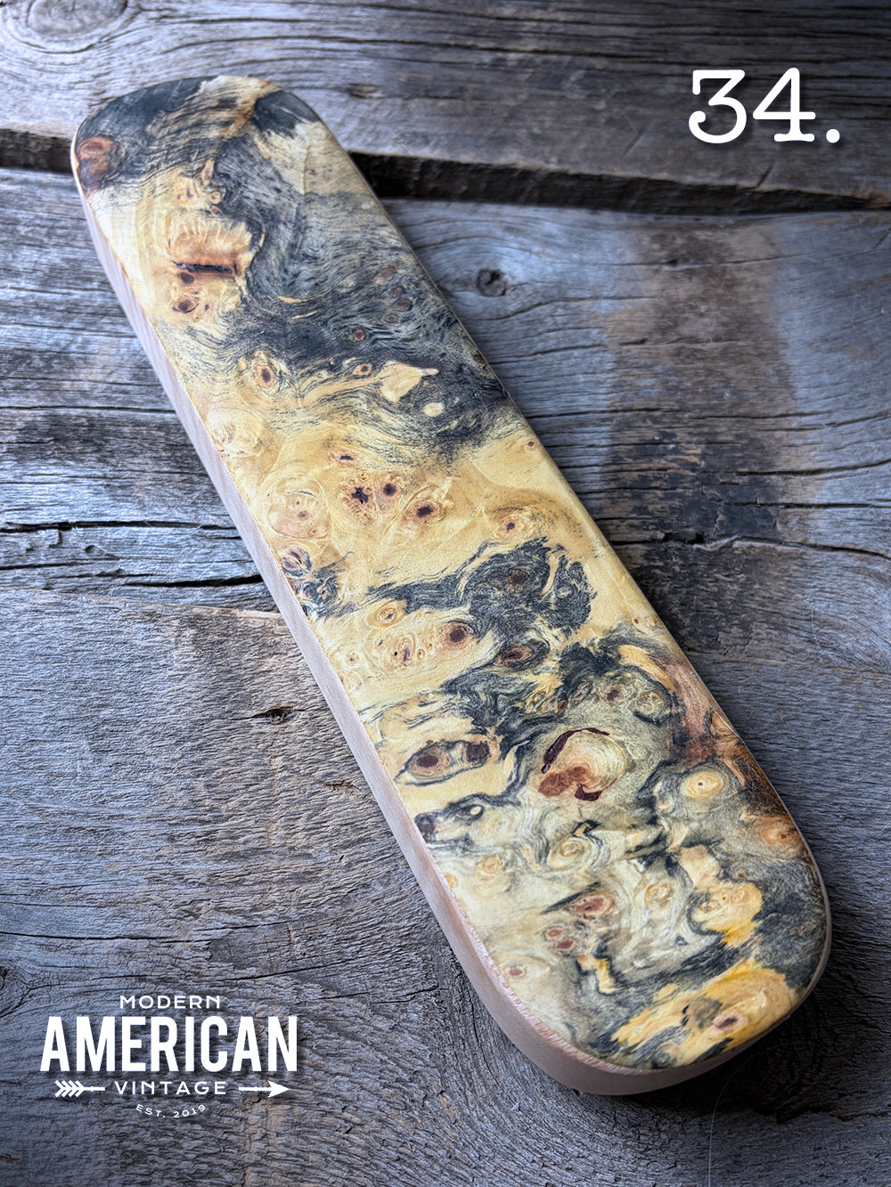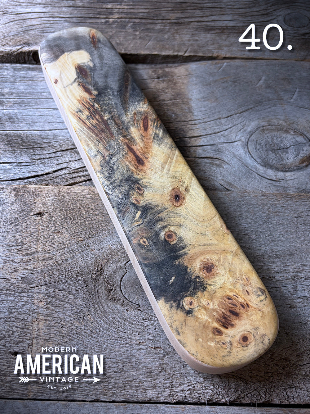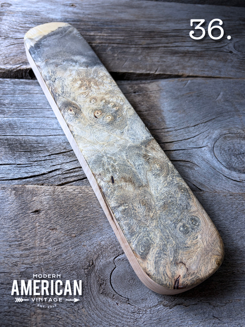 - Buckeye Burl top on Curly Maple base - 12.5x2.75x1"