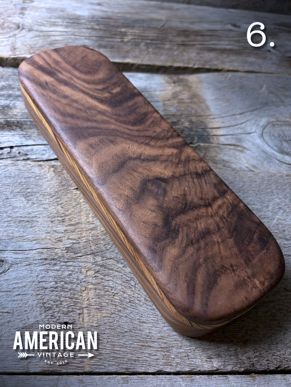 - Appalachian Walnut top, band of Zebrawood on Walnut base - 10x3"
